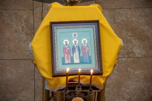 Ра́дуйтеся, трие́ святи́телие, вели́цыи и вселе́нстии учи́телие.