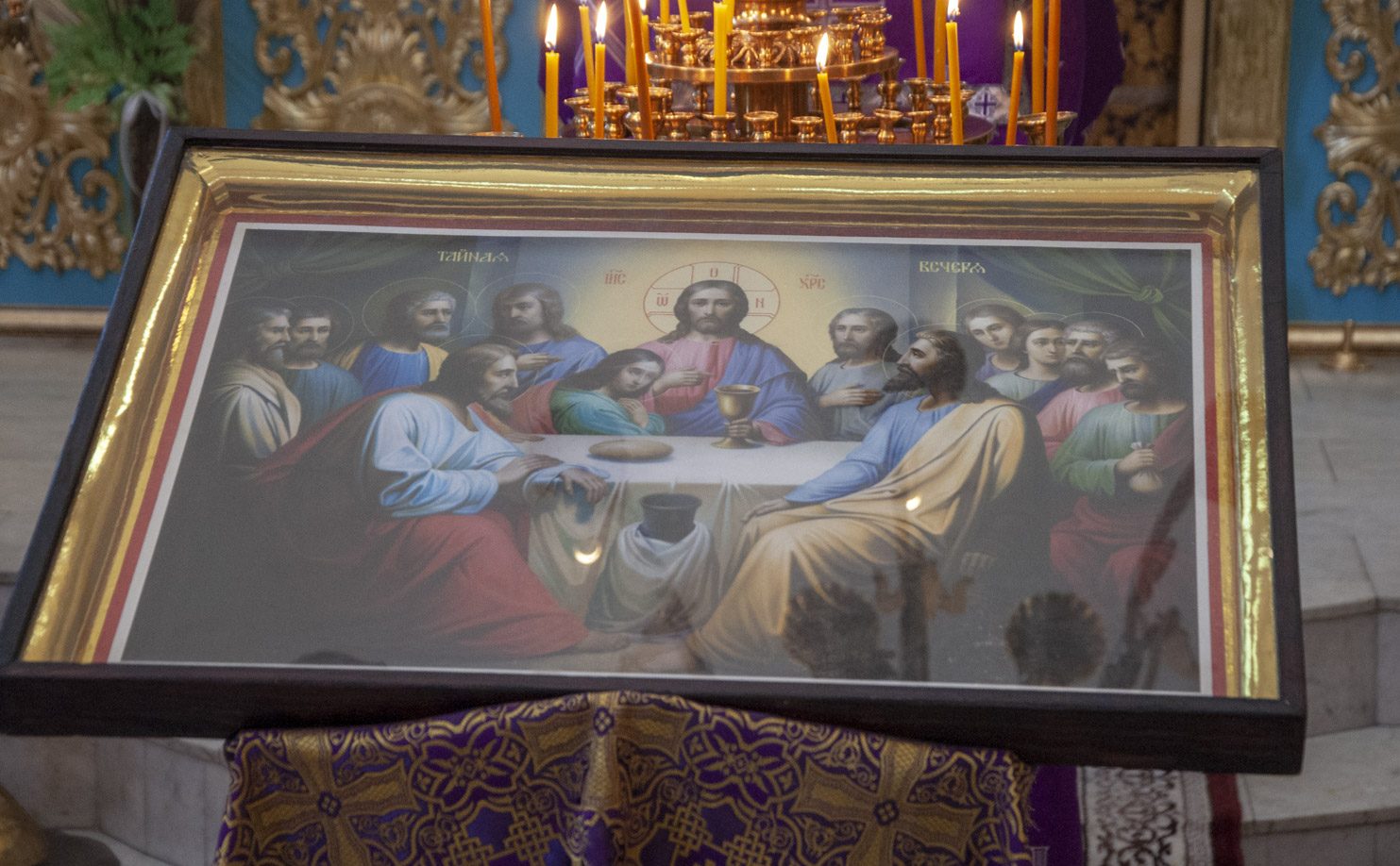 За богослужением Великого четвертка Церковью воспоминается Тайная Вечеря Христа Спасителя с учениками, на которой Господь установил Таинство Евхаристии — Причащения.