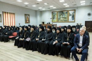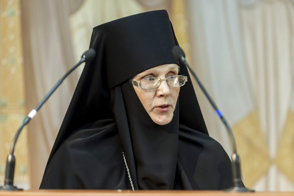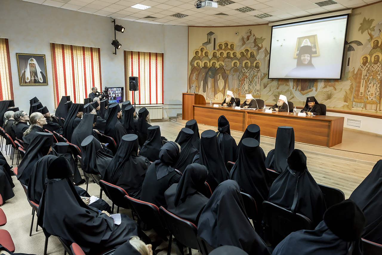 Приветствие председателя Синодального отдела по монастырям и монашеству по видеосвязи зачитала настоятельница Зачатьевского ставропигиального женского монастыря в Москве, заместитель председателя Отдела игумения Иулиания (Каледа).