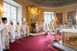 За Литургией Его Святейшеству сослужили: митрополит Воскресенский Григорий, управляющий делами Московской Патриархии, первый викарий Патриарха Московского и всея Руси по г. Москве, управляющий Центральным викариатством Московской (городской) епархии; митрополит Вологодский и Кирилловский Савва; митрополит Барнаульский и Алтайский Сергий; епископ Рубцовский и Алейский Роман; епископ Бийский и Белокурихинский Серафим; епископ Раменский Алексий, личный секретарь Святейшего Патриарха Кирилла; протопресвитер Владимир Диваков, секретарь Патриарха Московского и всея Руси по г. Москве, благочинный Центрального округа столицы, настоятель храма «Большое Вознесение»; протоиерей Николай Балашов, советник Патриарха Московского и всея Руси; игумен Дионисий (Воздвиженский), епархиальный духовник монастырей Вологодской епархии; игумен Ферапонт (Широков), наместник Спасо-Прилуцкого Димитриева мужского монастыря г. Вологды, проректор по воспитательной работе Вологодской духовной семинарии; иеромонах Мисаил (Сарафанов), помощник управляющего делами Московской Патриархии; клирики Алтайской и Вологодской митрополий, духовенство г. Москвы.