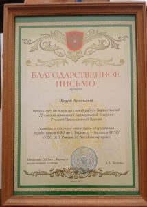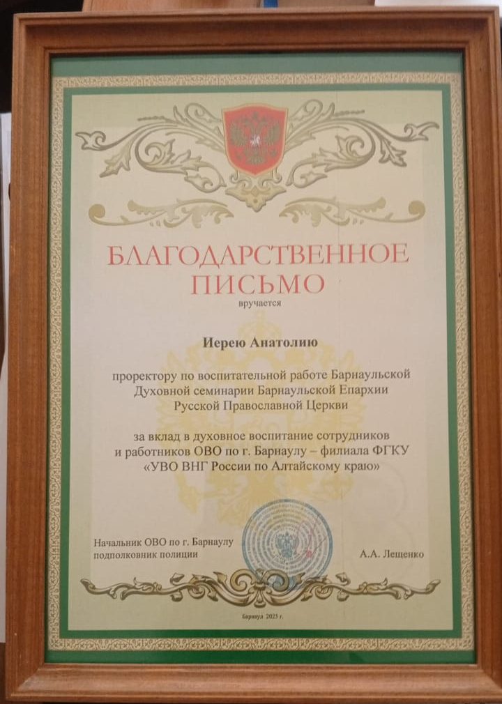 Отцу Анатолию вручили благодарственное письмо от начальника ОВО ПО г. Барнаулу подполковника полиции А. В. Лещенко.