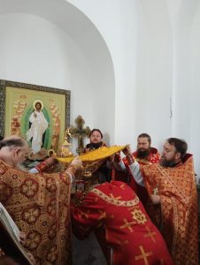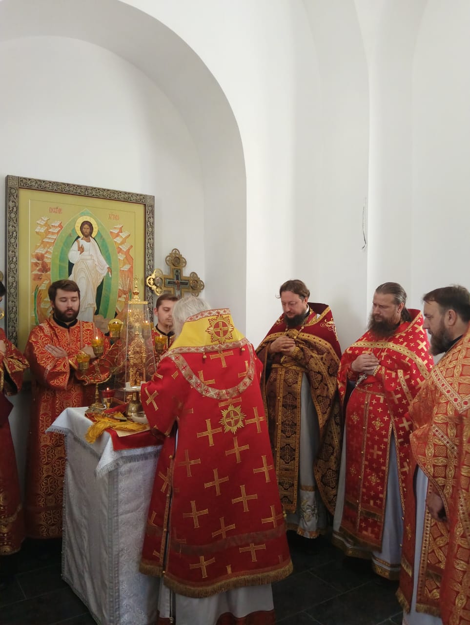 Его Высокопреосвященству сослужили: благочинный Белоярского округа протоиерей Вячеслав Данькин, врио ректора Барнаульской духовной семинарии иерей Анатолий Бочкар, протоиерей Анатолий Садовников, настоятель часовни иерей Алексий Овчинников, иерей Артемий Меркулов, руководитель службы протокола Барнаульской епархии диакон Олег Берендеев, диакон Владислав Лазарев и диакон Олег Вихлянов.