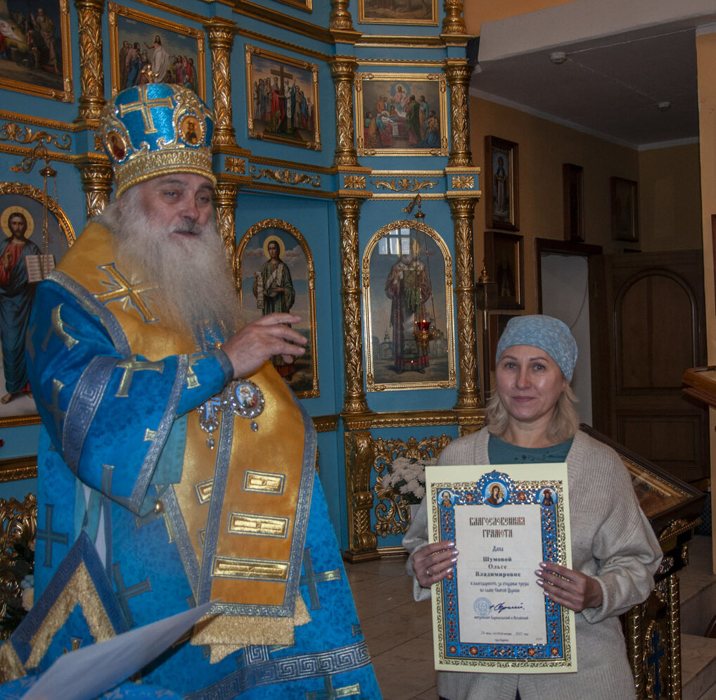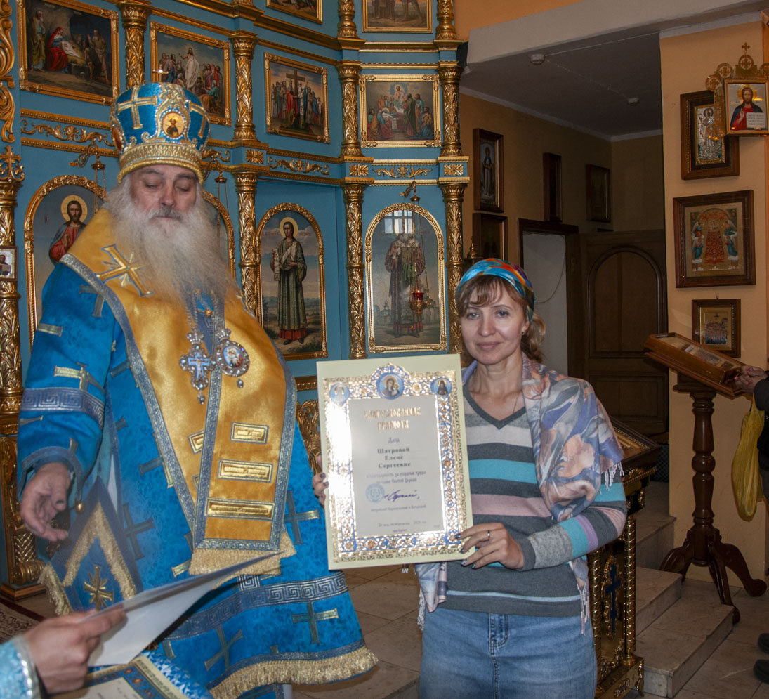 Далее Владыка Сергий обратился к врио ректору, преподавательскому составу, учащимся духовной школы и к прихожанам с проповедью, по окончании которой наградил тружениц, благоукрасительниц Иверского храма за усердное служение Святой Церкви Архиерейскими грамотами: Елену Шатрову, Ольгу Шумову и Ольгу Сарафанову, отметив что вот уже несколько лет праздничные богослужения не проходят без заботы по украшению храма и святых икон цветами и различными композициями. В благодарность духовенство и все молящиеся пропели Аксиа — достойны!