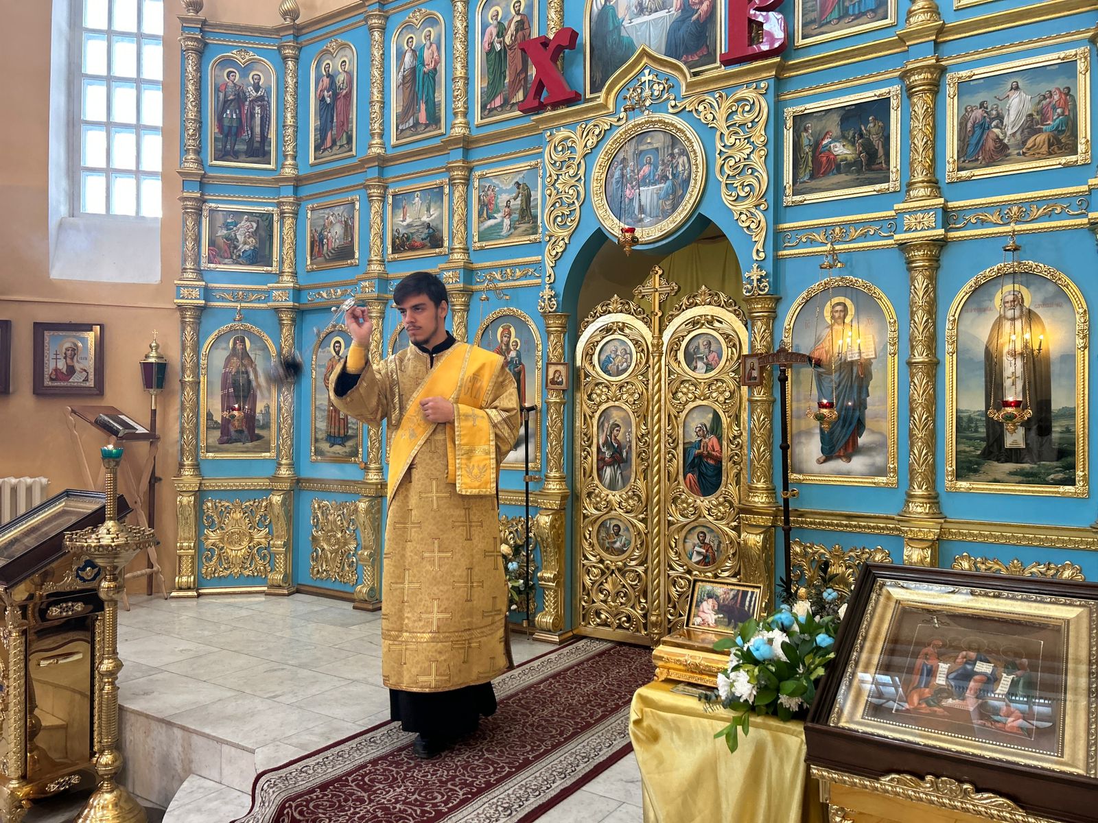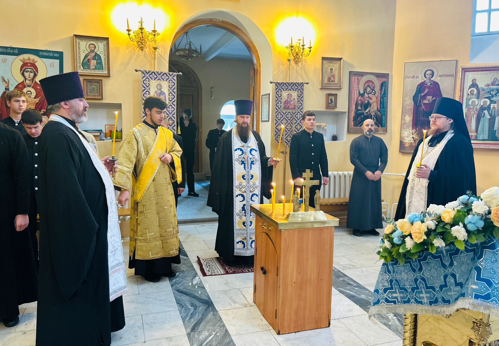 Его преподобию сослужили проректор по учебной работе иерей Алексий Изосимов, старший помощник проректора по воспитательной работе иеромонах Модест (Илюшин) и студент 3 курса диакон Олег Вихлянов.