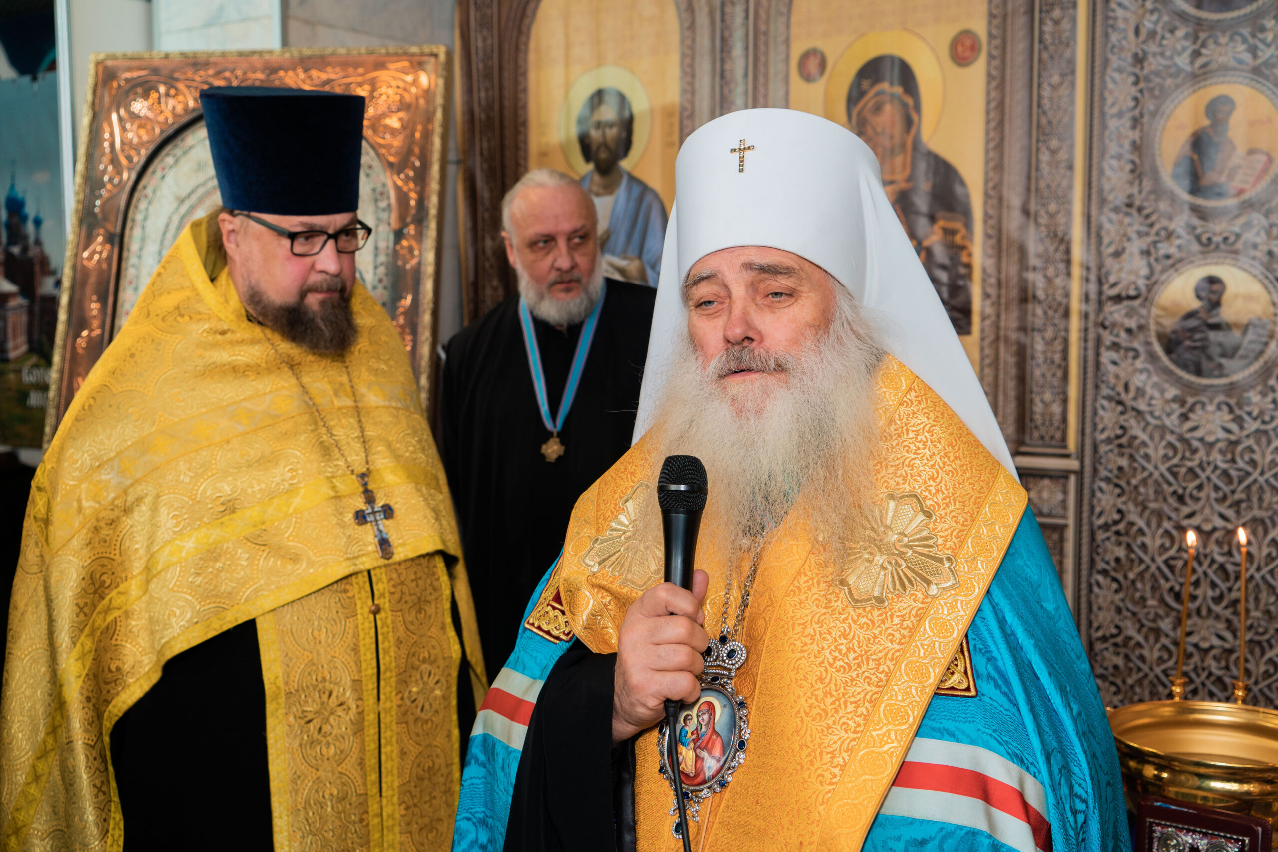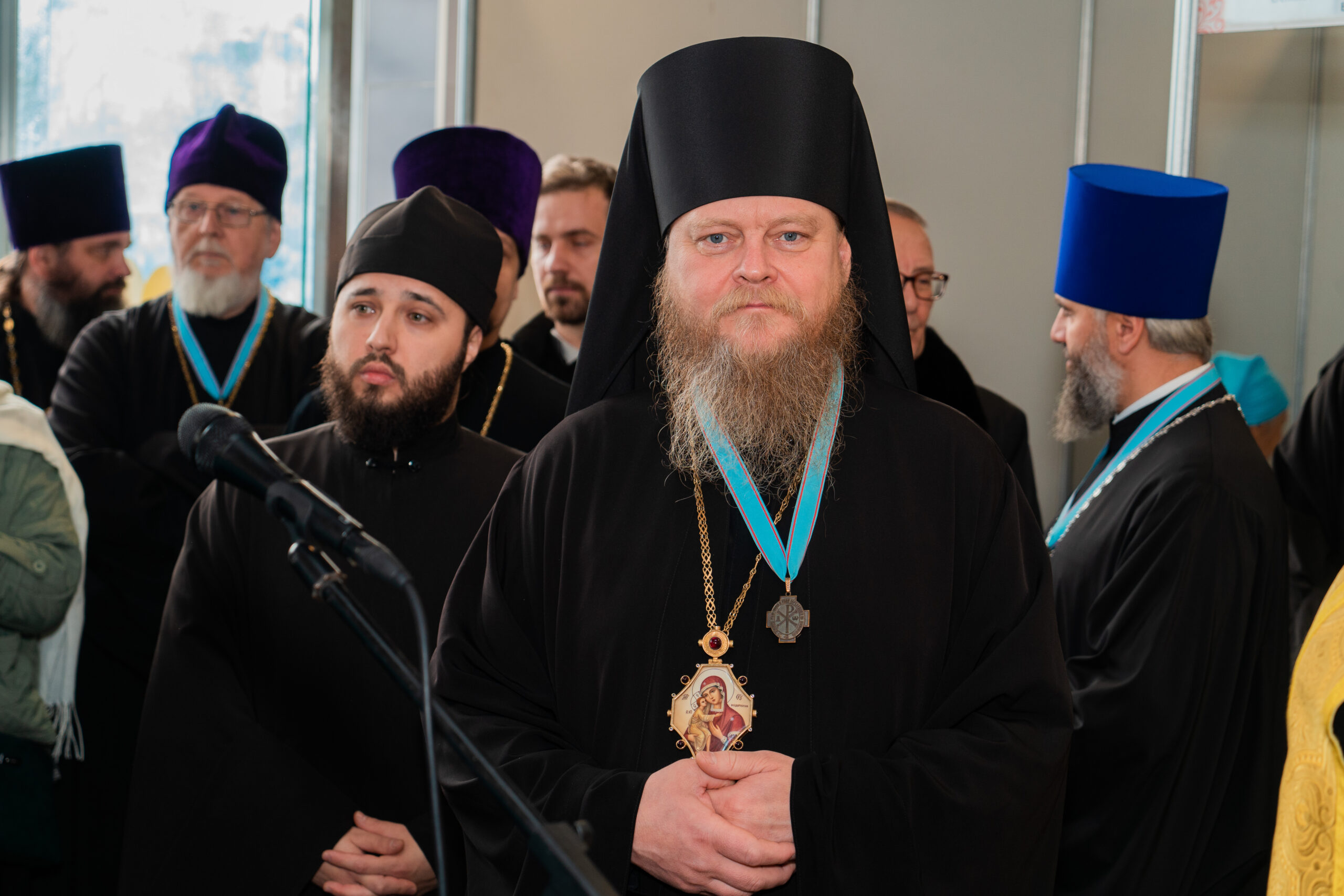 Митрополит Сергий по окончании молебна обратился к участникам и посетителям православного проекта с напутственным словом и высокой оценкой православной выставки.