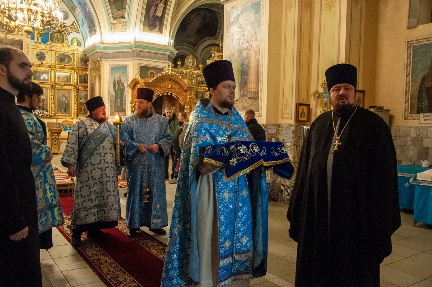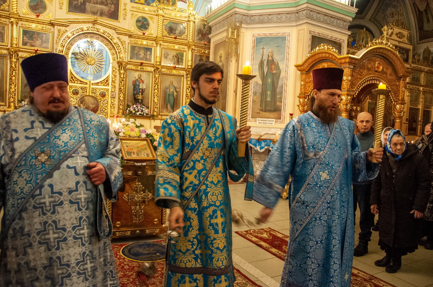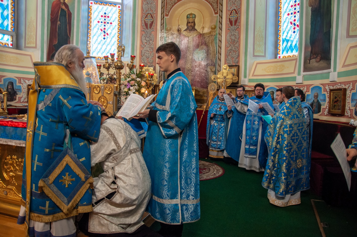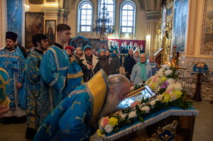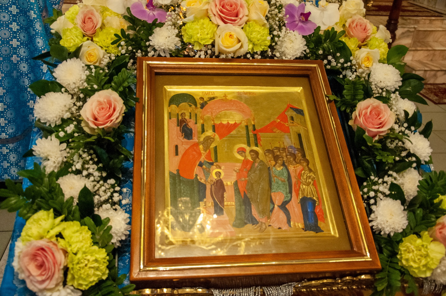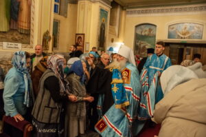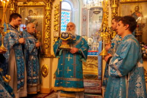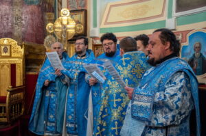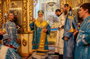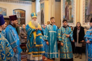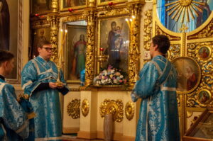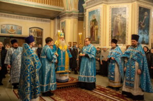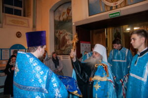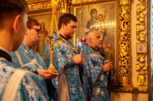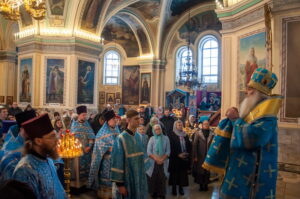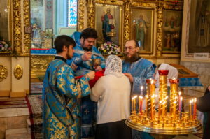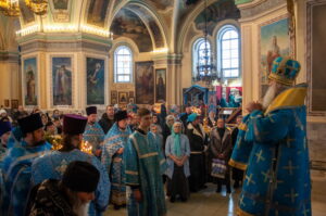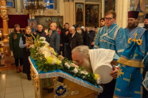 После отпуста Литургии у иконы праздника в центре храма было совершено славление. Были пропеты тропарь и кондак Введения во храм Пресвятой Богородицы, после чего все присутствующие за богослужением вместе с духовенством пропели молитву «Царице моя Преблагая» и величание.
