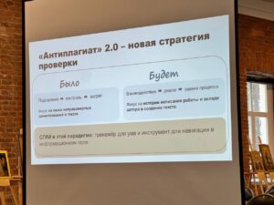 О. В. Молчанова, ведущий специалист учебно-методического центра компании «Антиплагиат», выступила с докладом «Инструмент? Помощник? Соблазн? Или как оценить качество квалификационных работ в эпоху развития СГИИ».