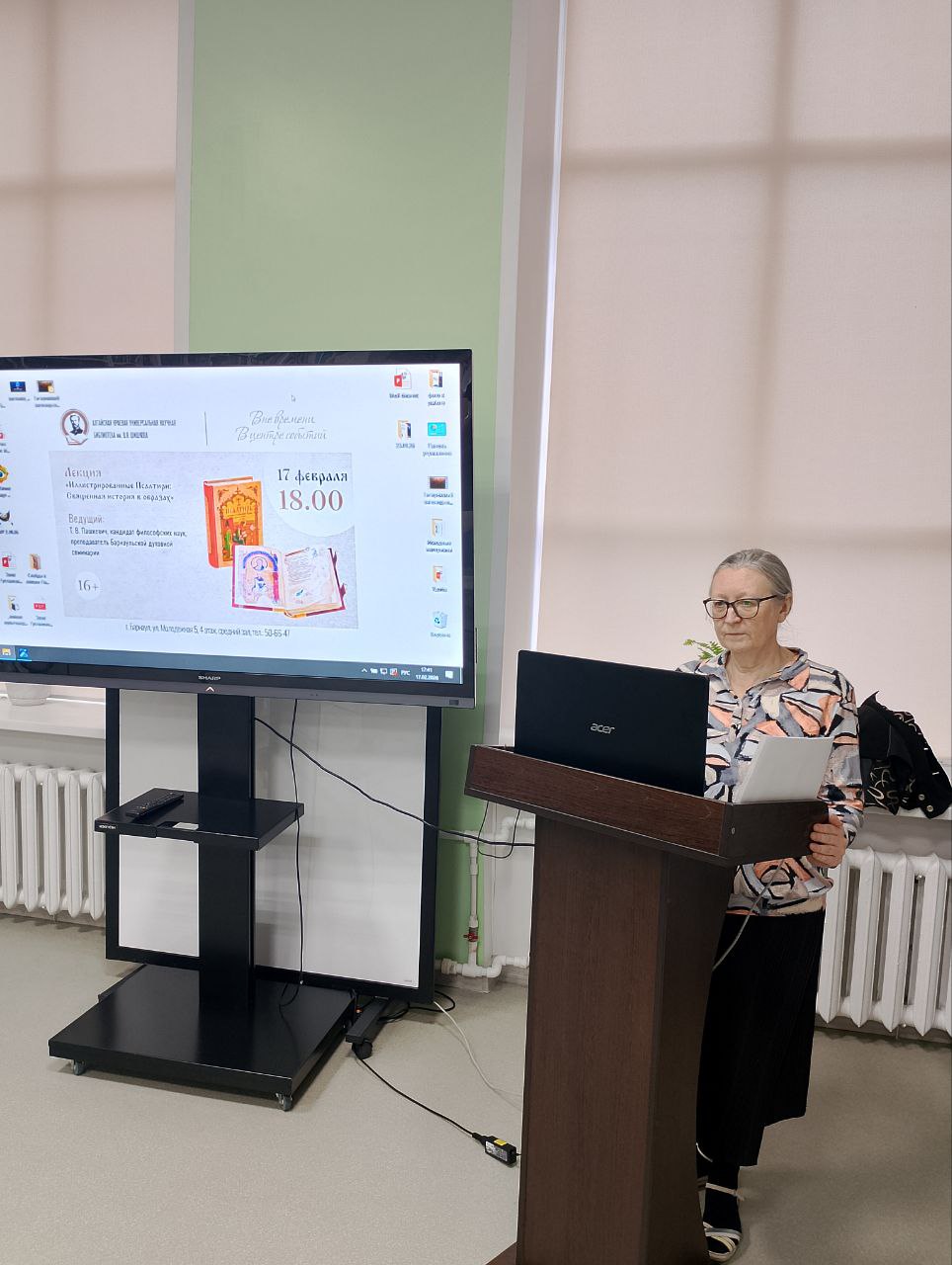17 февраля в Алтайской краевой библиотеке им. В. Я. Шишкова состоялась лекция преподавателя Барнаульской духовной семинарии Татьяны Владимировны Пашкевич на тему иллюстрированных Псалтирей. В этой лекции внимание было сосредоточено на том, как в иллюстрациях показана Священная история.
