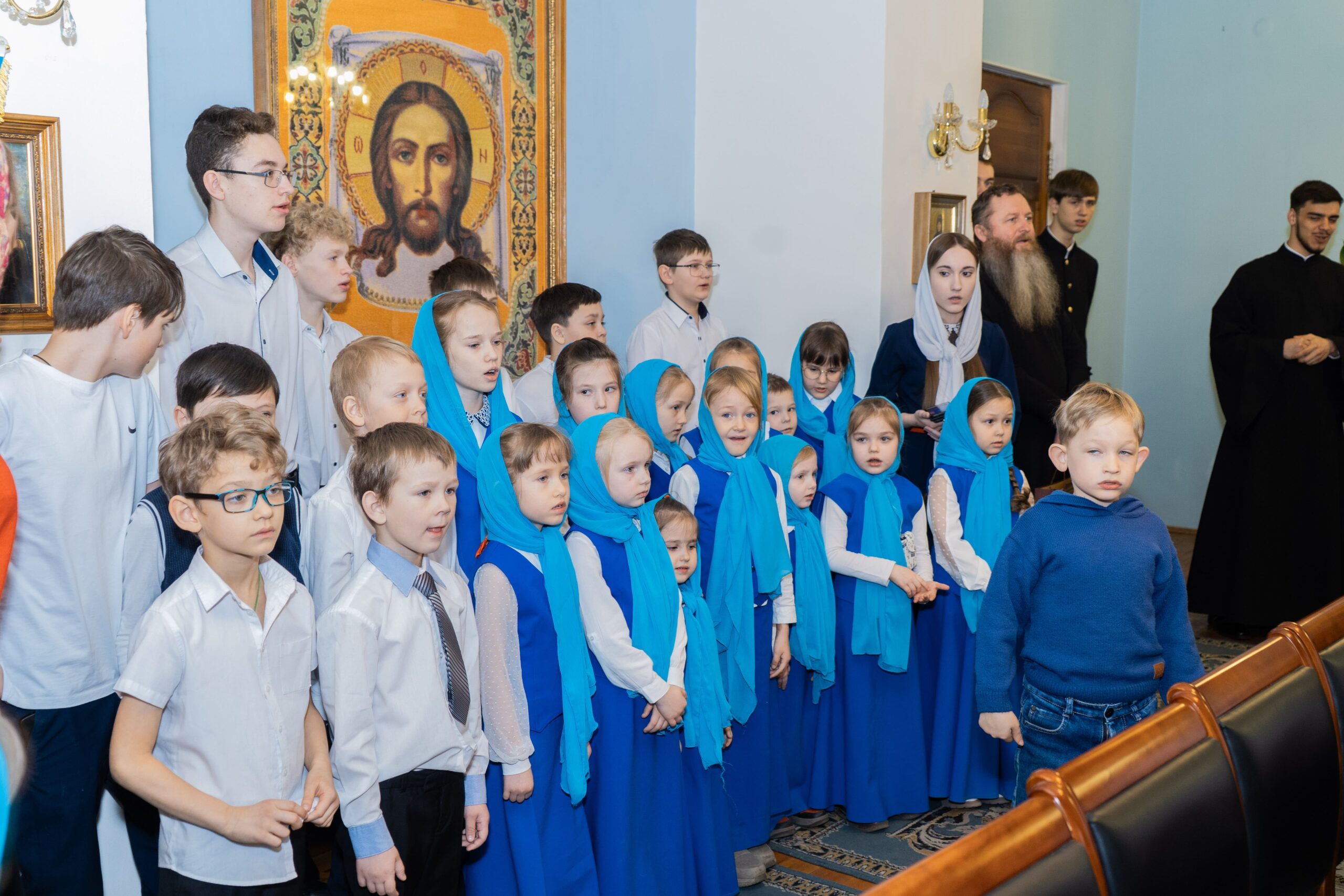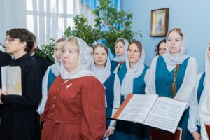 Митрополит Сергий произнес приветственное слово, после чего прозвучали праздничные песнопения в исполнении трех хоров: семинарии, регентской школы и воскресной школы.