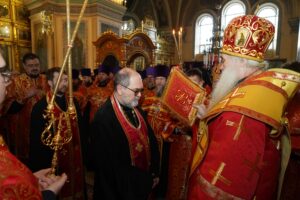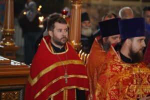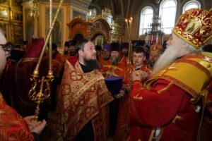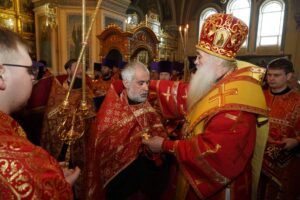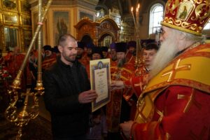 Во время великой Пасхальной вечерни глава Алтайской митрополии вручил священнослужителям церковные награды.