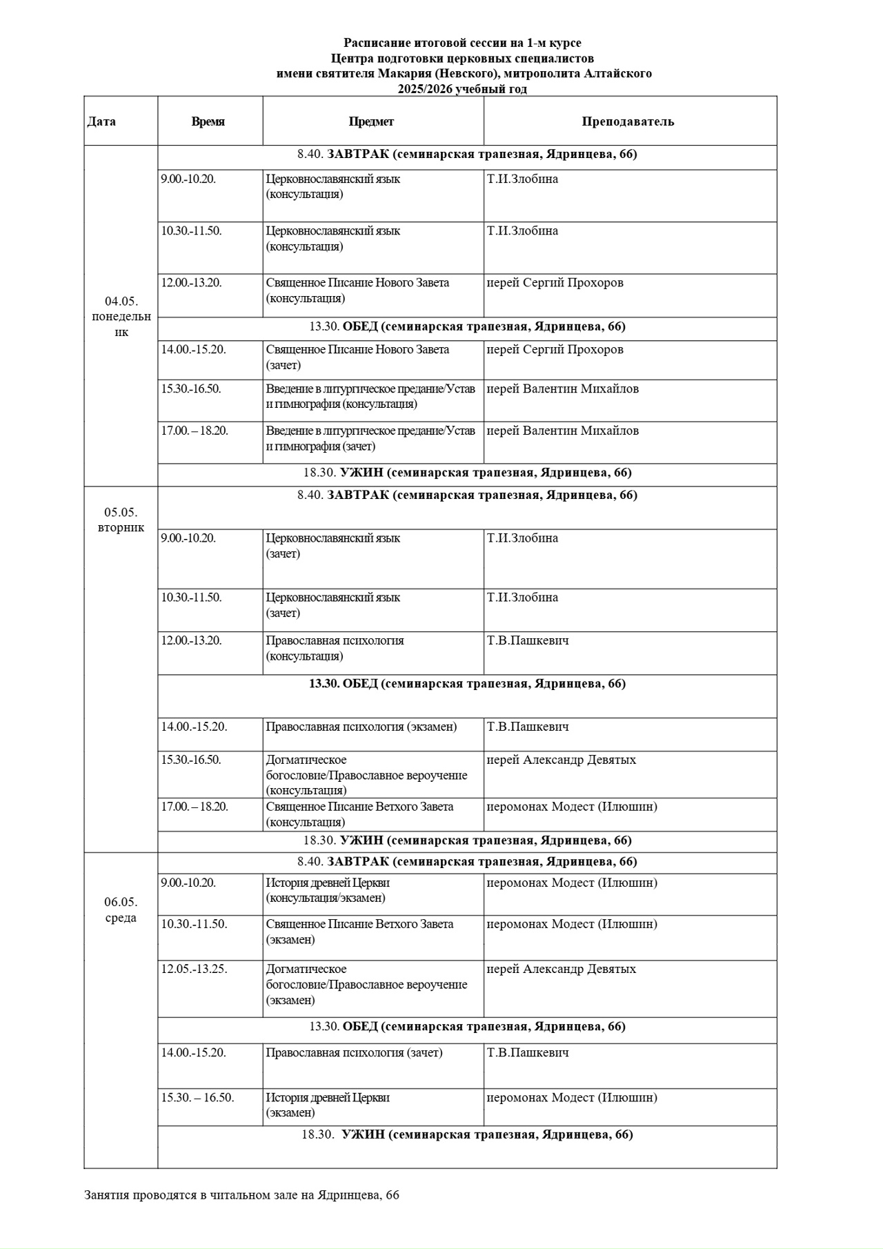 Итоговая сессия 1 курса Центра подготовки церковных специалистов имени святителя Макария (Невского), митрополита Московского и Алтайского в период с 4 по 6 мая.